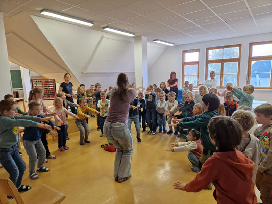 Am 23. Oktober durften wir Mai Cocopelli bei uns begrüßen. Gemeinsam mit ihr sangen wir die ersten Lieder in unserer Aula – begleitet natürlich von der Ukulele. Jedes Kind bekam die Gelegenheit, selbst auf der Ukulele zu spielen. Dabei gilt: Heute lerne ich – morgen lehre ich! So wird jedes Kind zur Lehrerin oder zum Lehrer für das nächste Kind.